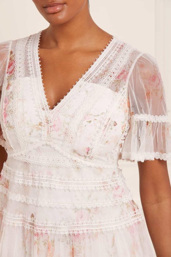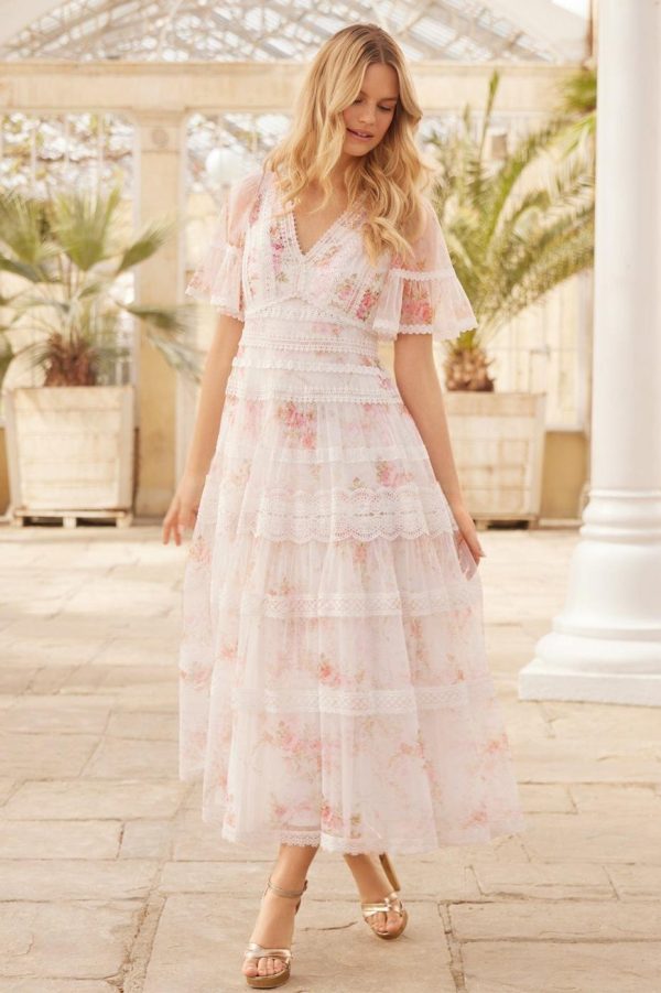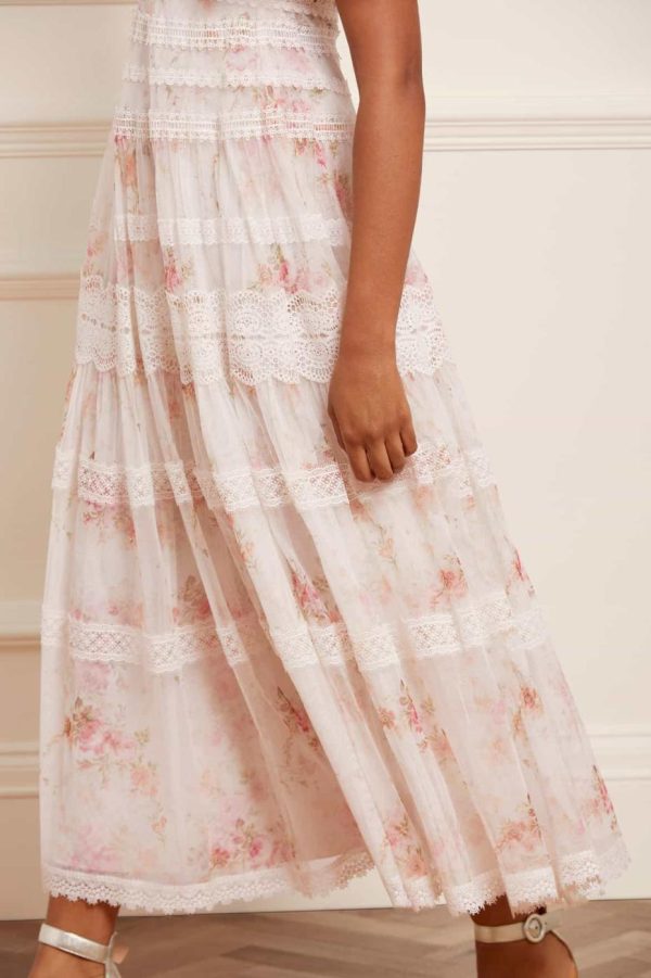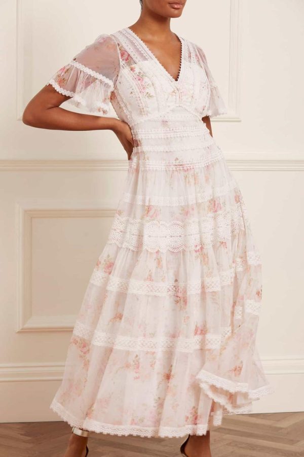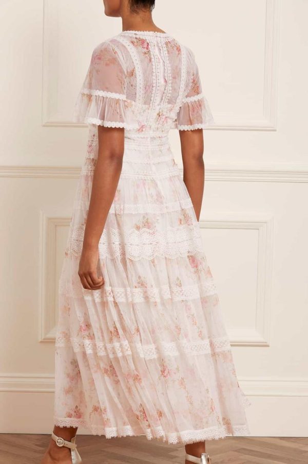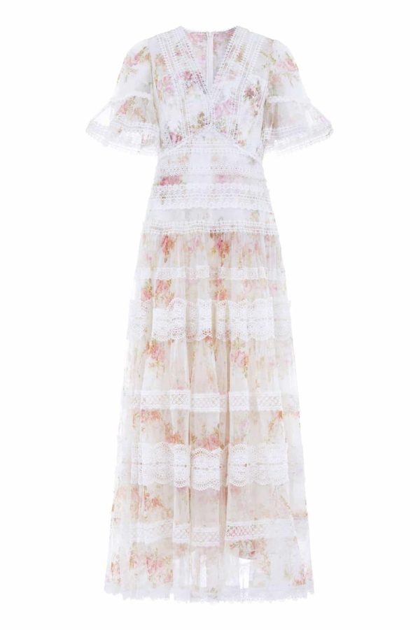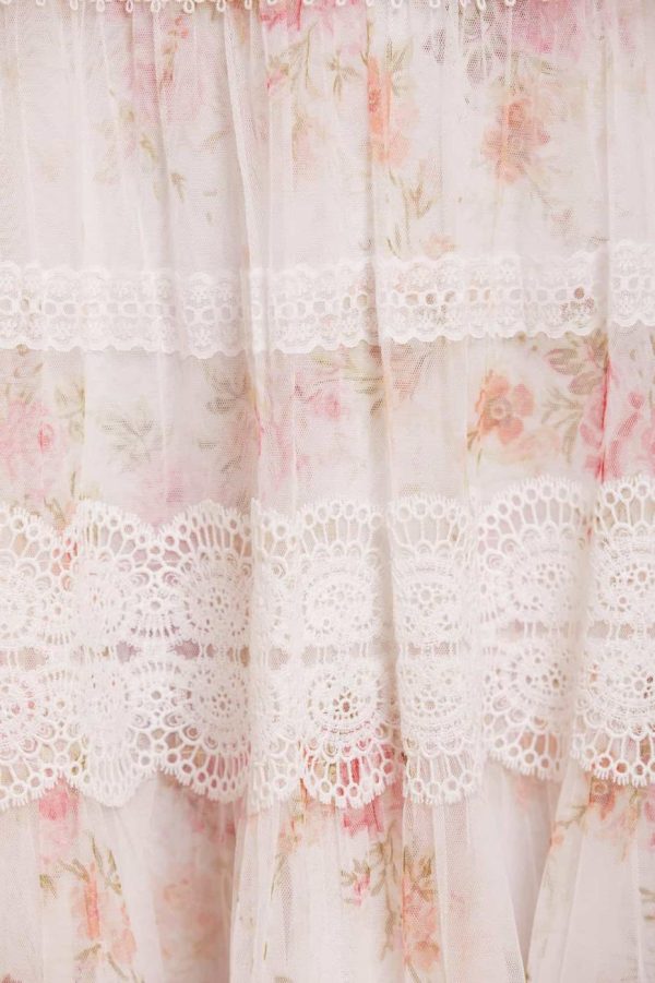 The Trailing Blooms Lace Ankle Gown in Moonshine. This beautifully printed gown is designed with a floral motif in soft pink tones, inspired by a hand-painted 1900’s artwork. Created with floral lace fabric for vintage-inspired detailing. Developed with intricate lace trims bordering throughout in various shapes and designs. A piece you’ll always love.