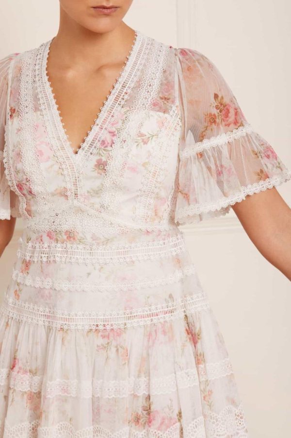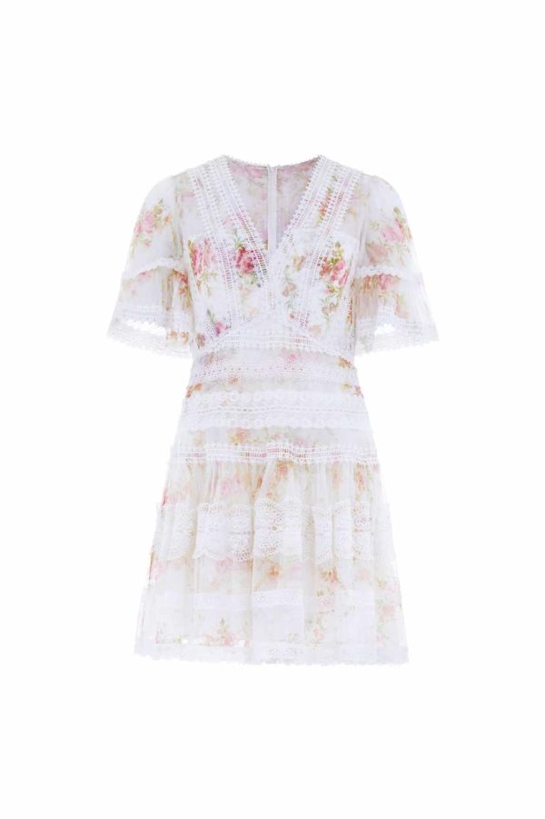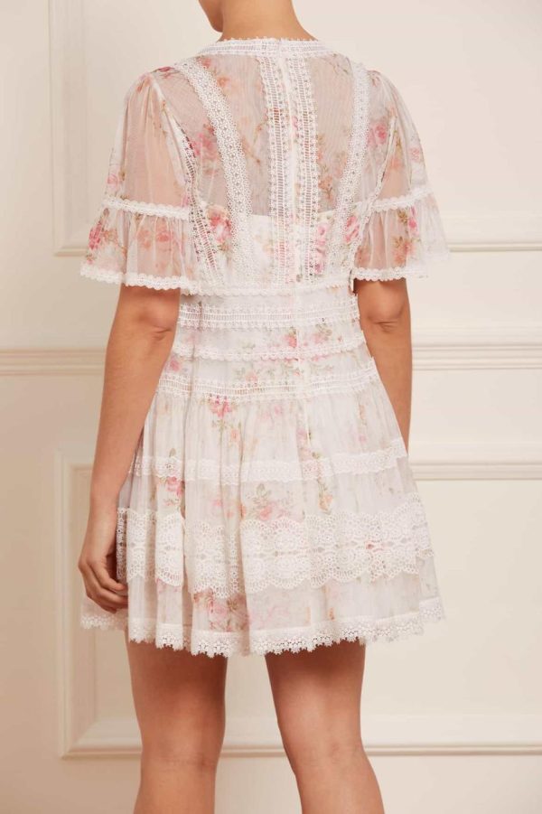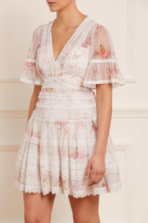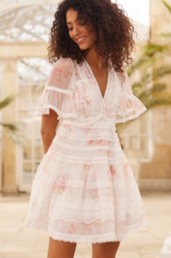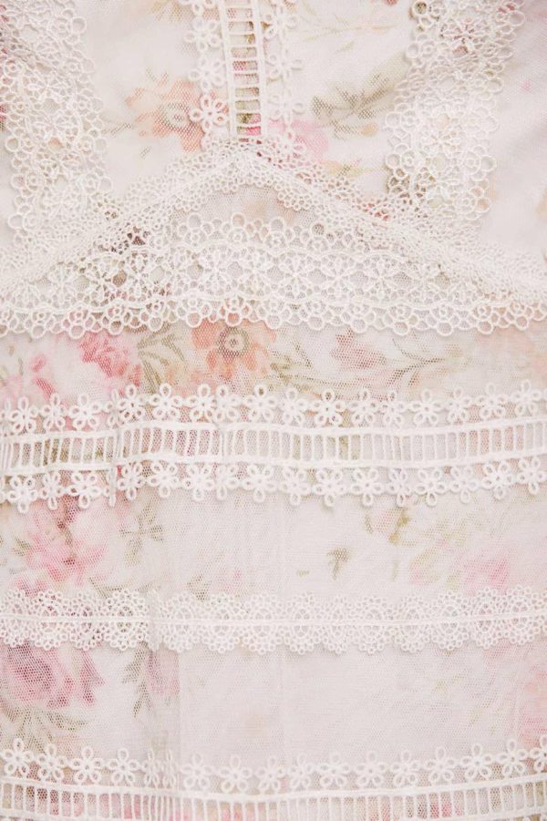 The Trailing Blooms Lace Micro Mini Dress in Moonshine. This beautifully printed dress is designed with a floral motif in soft pink tones, inspired by a hand-painted 1900’s artwork. Created with floral lace fabric for vintage-inspired detailing. Developed with intricate lace trims bordering throughout in various shapes and designs. A piece you’ll always love.