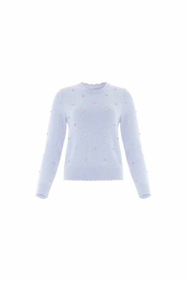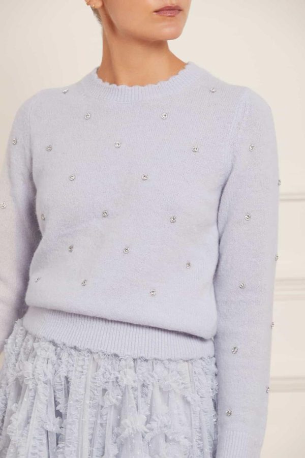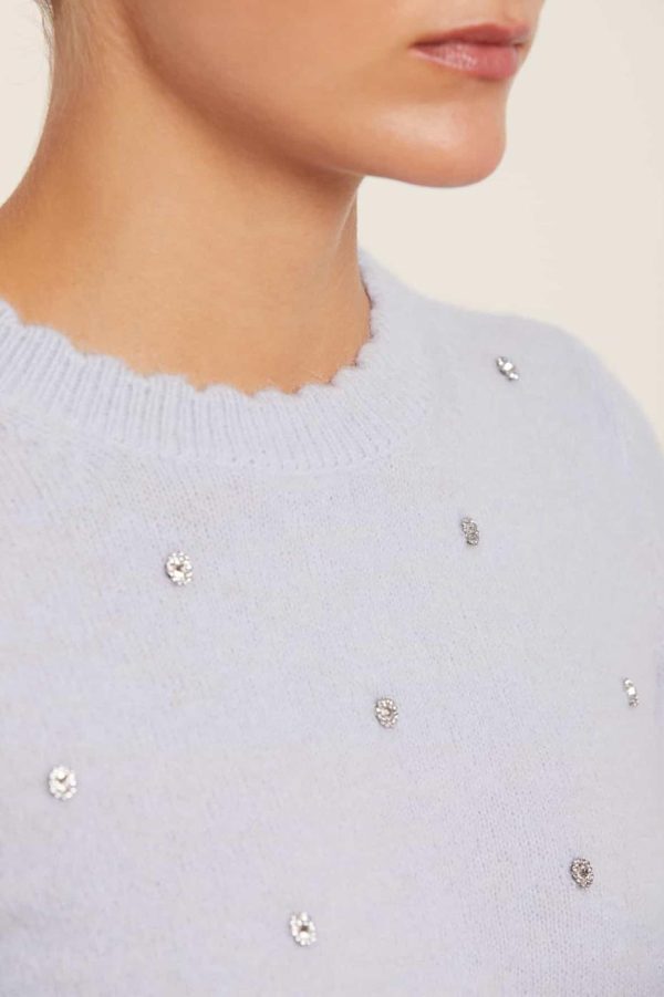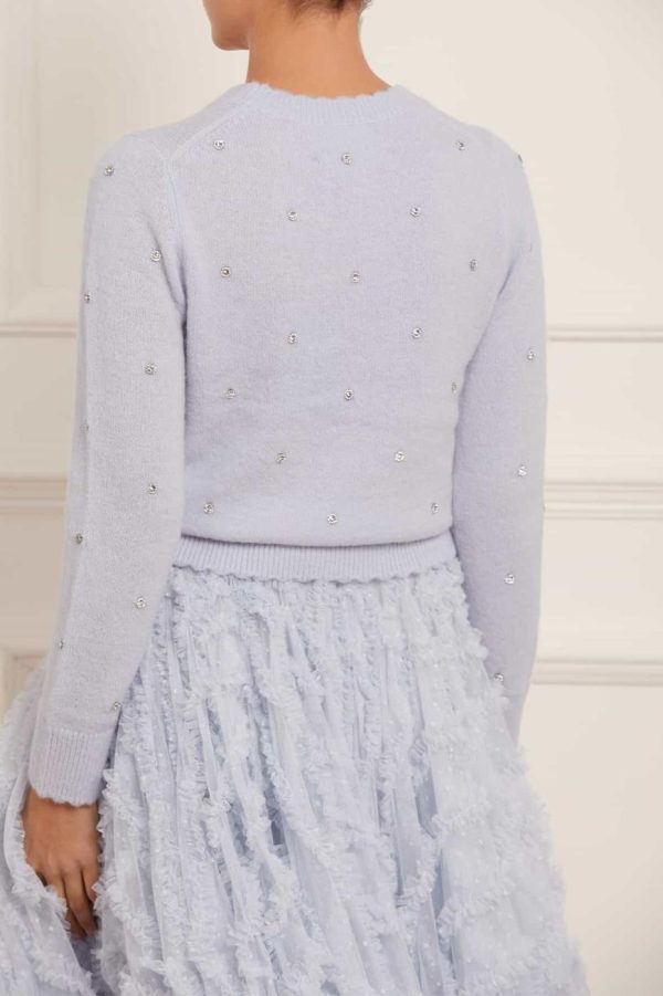 Discover our stunning Embellished Short Jumper in a beautiful Pale Blue shade. This premium jumper features ultra-soft alpaca-blend yarn that delivers exceptional comfort with a luxurious, plush texture. Elegant crystal embellishments arranged in a delicate floral pattern create a sophisticated sparkle that elevates any outfit. Designed with a flattering slim fit through the sleeves and body, complete with signature Needle & Thread scallop trim detailing at the cuffs and hem for that perfect finishing touch. This versatile piece is sure to become your new go-to wardrobe essential.