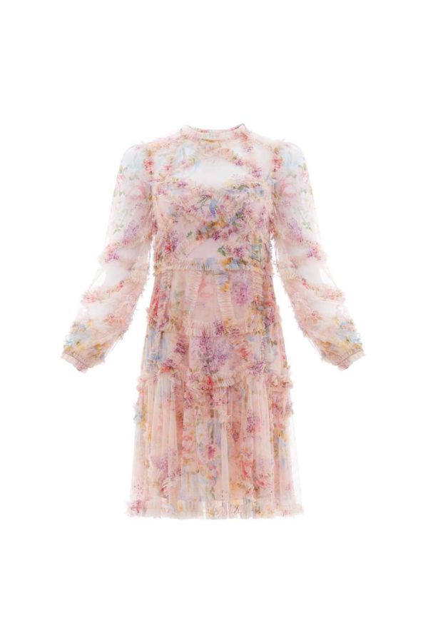 Floral Diamond Ruffle Dress in Topaz Pink. This stunning piece features delicate ruffled tulle with an exclusive vintage print inspired by early 1900’s hand-painted fabric designs. Experience romantic elegance with statement cuffed sleeves and a beautifully tailored skirt that flows gracefully from the body, creating captivating movement in the tulle fabric. This Victorian-inspired design with modern sophistication will become the standout piece in your collection.