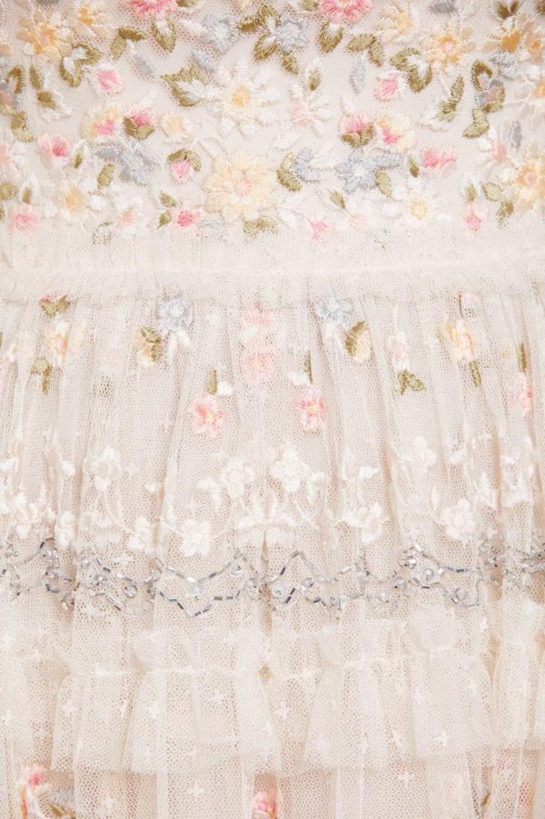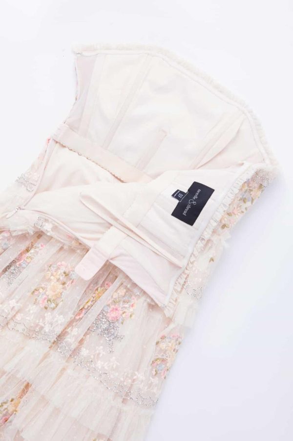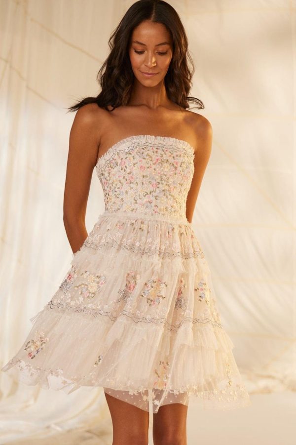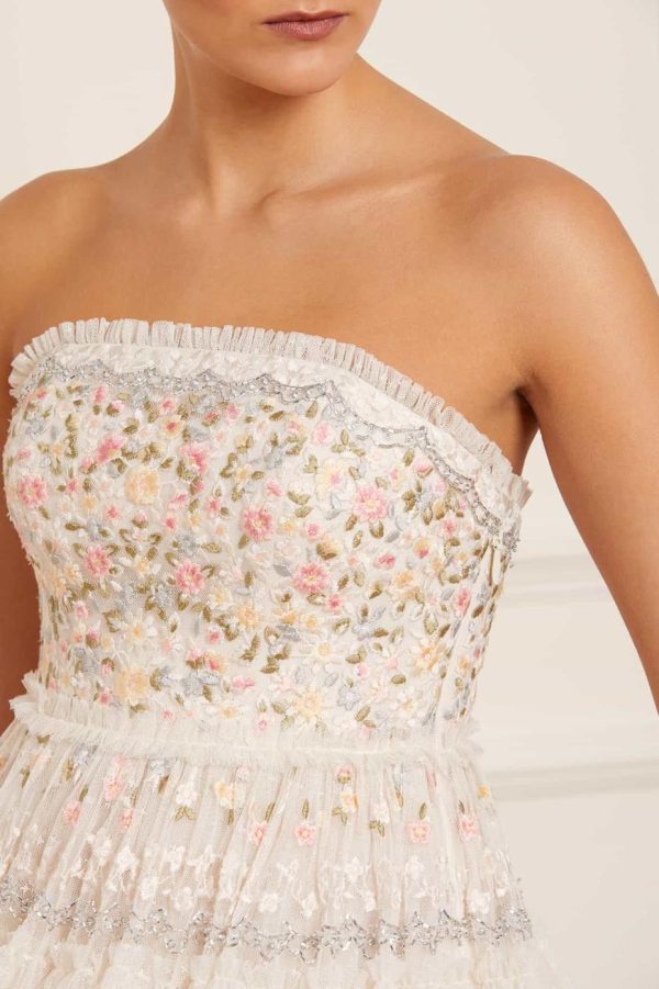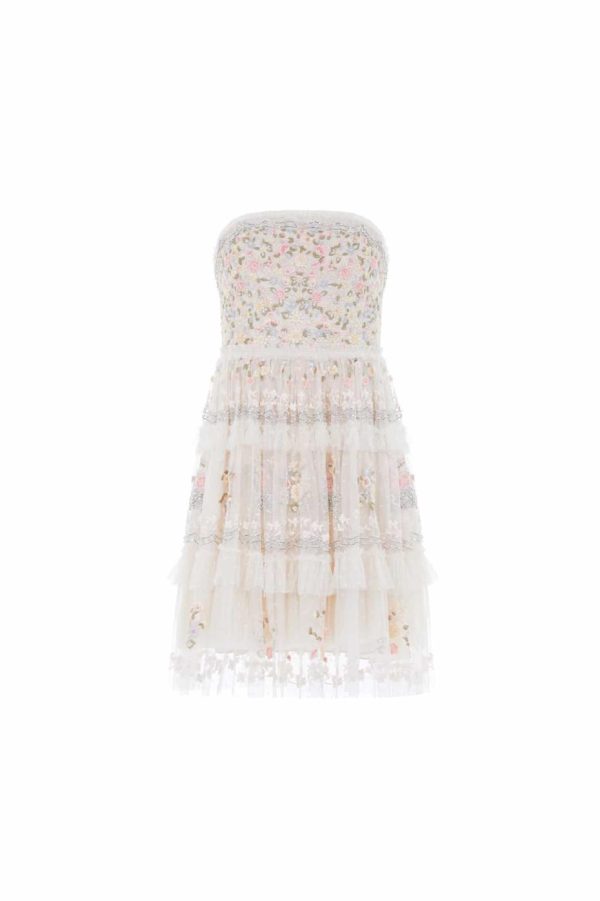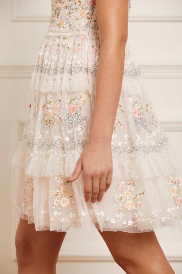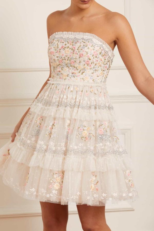 Elevate your special occasion wardrobe with the Primrose Bouquet Strapless Micro Mini Dress in Cream. This stunning dress features exquisite embroidery and intricate beading craftsmanship throughout. Beautifully decorated with delicate floral border motifs that draw inspiration from fresh garden bouquets. The design showcases sophisticated embellishment using silver cut beads and components that create captivating shimmer highlights. The silhouette features strategically placed tulle frills and multiple layers of netting that create beautiful romantic volume. Designed with an integrated corset featuring precision ribbon stitching, flexible boning and stretch mesh fabric panels for exceptional comfort and secure fit. Make an unforgettable statement in the Primrose Bouquet.