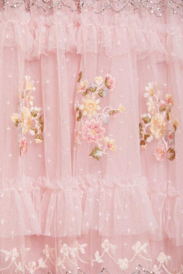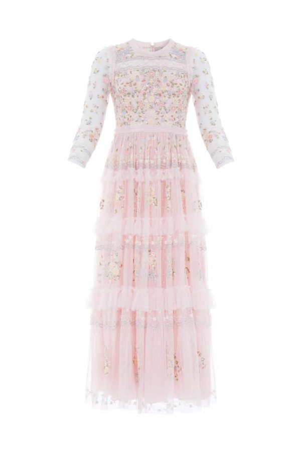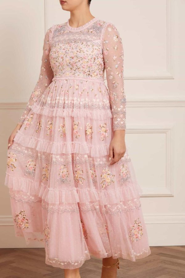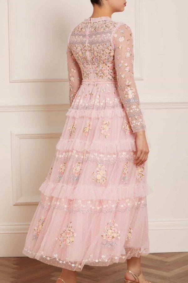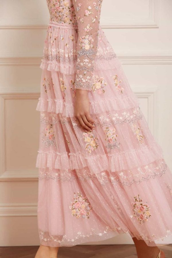 Discover the enchanting Primrose Bouquet Long Sleeve Ankle Gown in a delicate Blush Pink shade. This exquisite gown features intricate embroidery and precision beading that creates a luxurious appearance. Adorned with beautiful floral border motifs inspired by fresh garden bouquets. The design incorporates elegant silver cut beads and decorative components that catch the light beautifully. The dress silhouette features strategically placed tulle frills and multiple net layers that create a romantic, flowing volume. Perfect for making a memorable impression at special occasions.