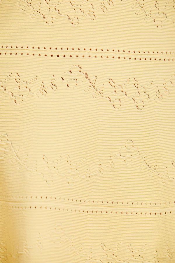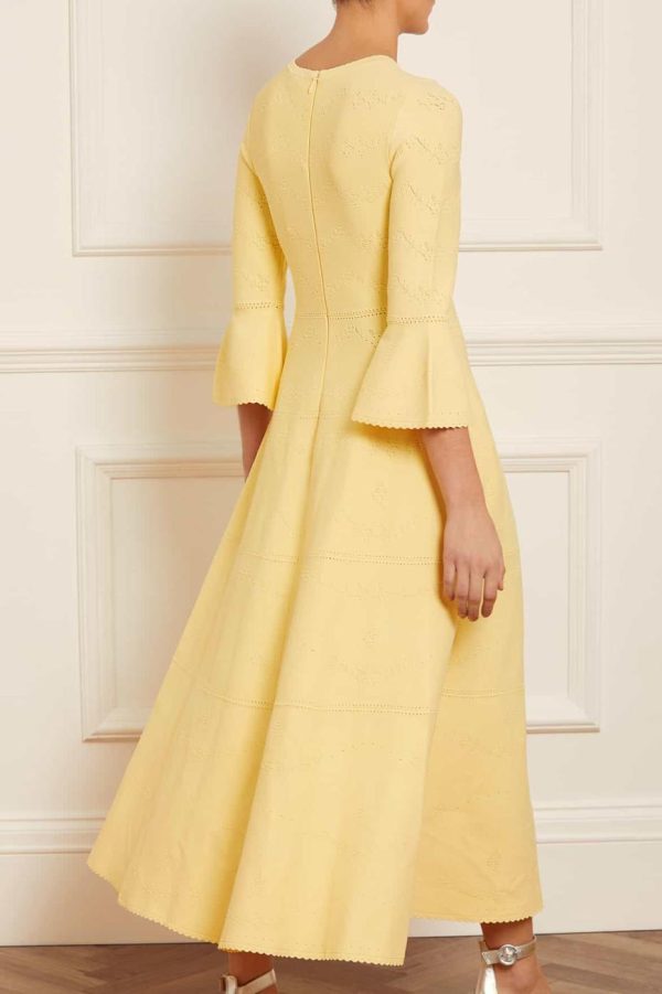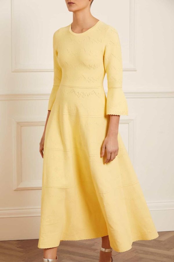Discover the exquisite Pretty Pointelle Knit Gown in a refreshing Lemon hue. This brand new Needle & Thread design captures the timeless charm of vintage floral patterns and delicate lacework. Expertly crafted with intricate all-over pointelle stitching, beautiful floral motifs, and elegant scalloped accents. Features a comfortable stretch bodice with a soft round neckline, graceful fluted cuffs, and signature Needle & Thread craftsmanship. An effortlessly flattering piece that combines comfort with sophisticated style.