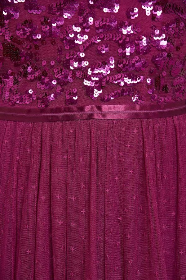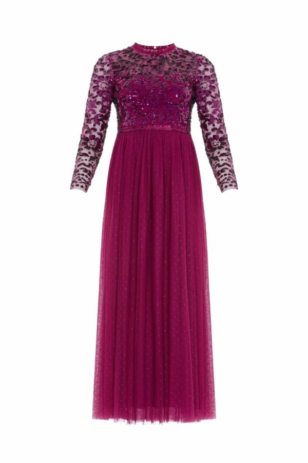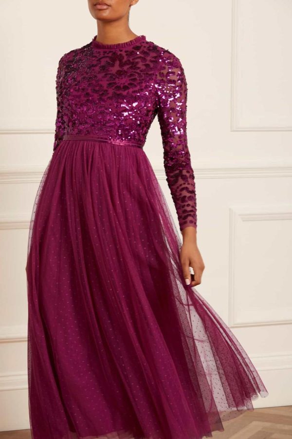 NEW SEASON | NEEDLE & THREAD EXCLUSIVE. The Tempest Bodice Ankle Gown in Plum features a stunning vintage-inspired lace tablecloth design, beautifully enhanced with shimmering sequin embellishments across the entire bodice. Designed with elegant long sleeves and a graceful layered tulle skirt showcasing a distinctive ‘x’ motif, finished with delicate frill trim detailing around the neckline. Make a breathtaking entrance in the unforgettable Tempest gown.